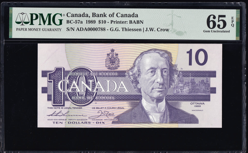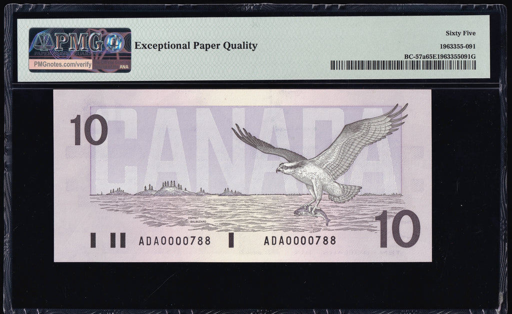 1989 Bank of Canada $10 "Low Serial 0000788" in PMG Gem UNC-65 (BC-57a N1)